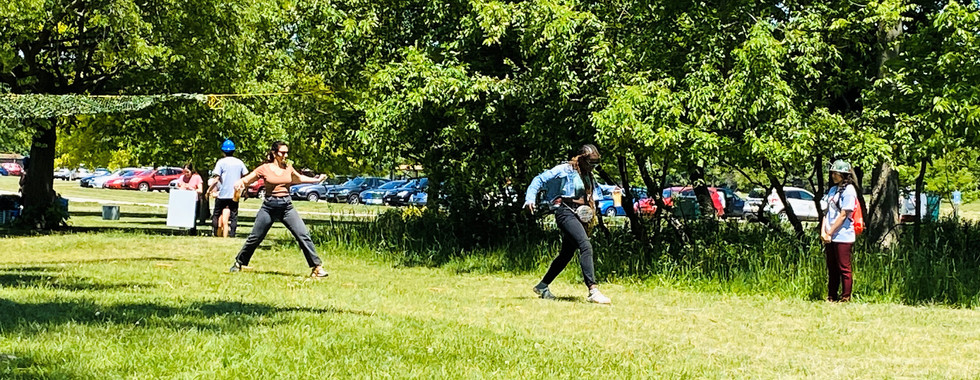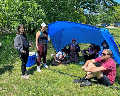 In addition to the spectacular simulation exercise, our guests were invited to picnic with us and engage in a variety of arts and crafts and games. Several REACH board members and volunteers taught guests how to play bocce ball and croquet, assisted children with making bracelets and nature cards, and helped serve a delicious buffet of finger food from our friends at Libanais restaurant and Villa Palermo pizza, both located on Devon Avenue. Our partners at the American Red Cross provided REACH Peer Mentors with IHL t-shirts and first aid kits and brought volunteers to help with music, photography, and games. In addition to co-sponsoring the event, Forest Preserves of Cook County sent staff to participate in the simulation and share information with guests about the natural resources available in our own backyards. We were also pleased to host several young women and their mentors from Girl Forward, another local youth development organization serving newcomers.
